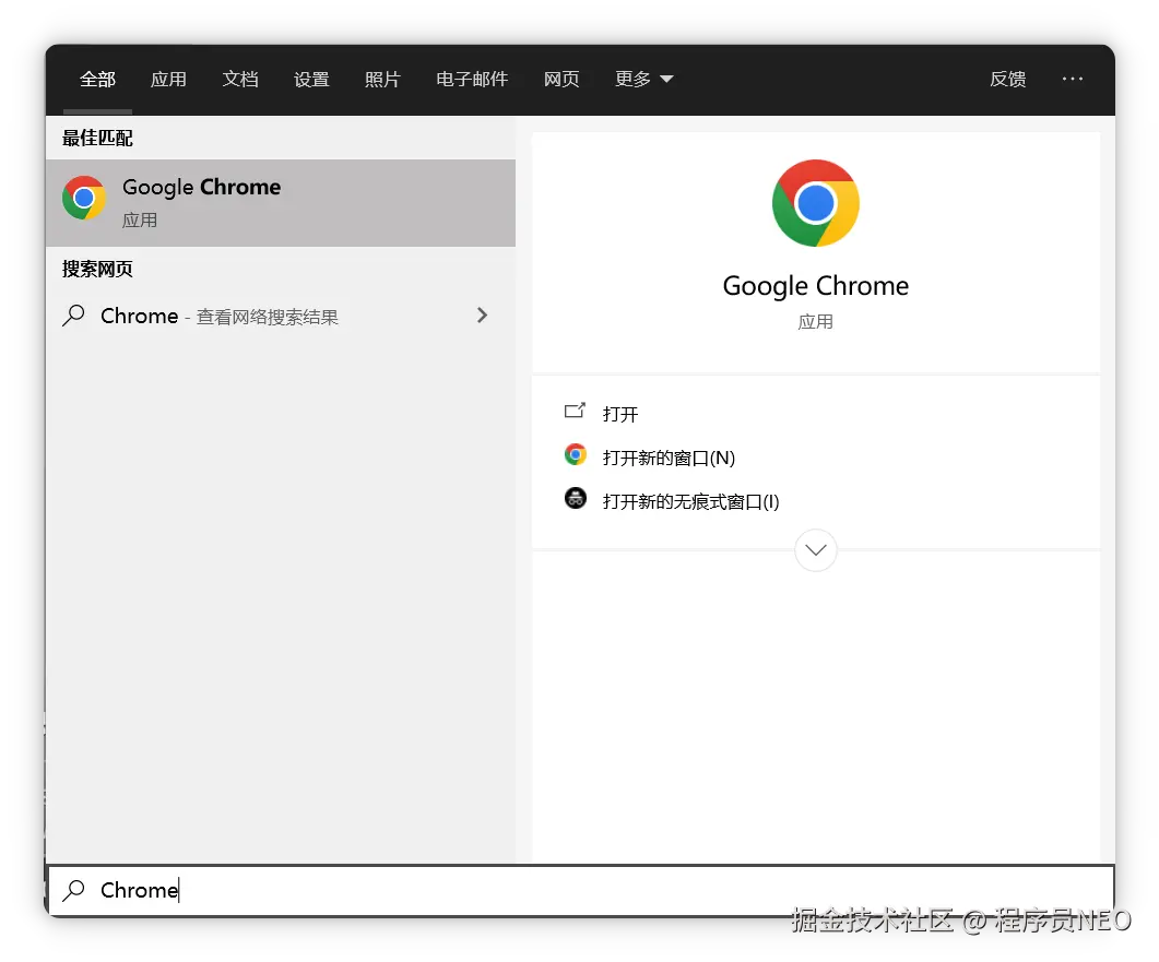 具体操作如下:在 Windows 搜索栏输入 Chrome: