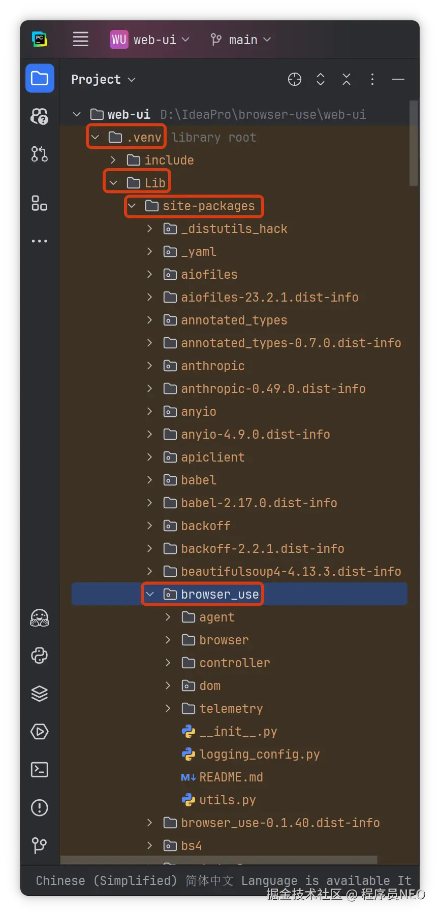 来看下核心代码,找到 .venv 文件夹,进入 Lib\site-packages\browser_use 目录:
