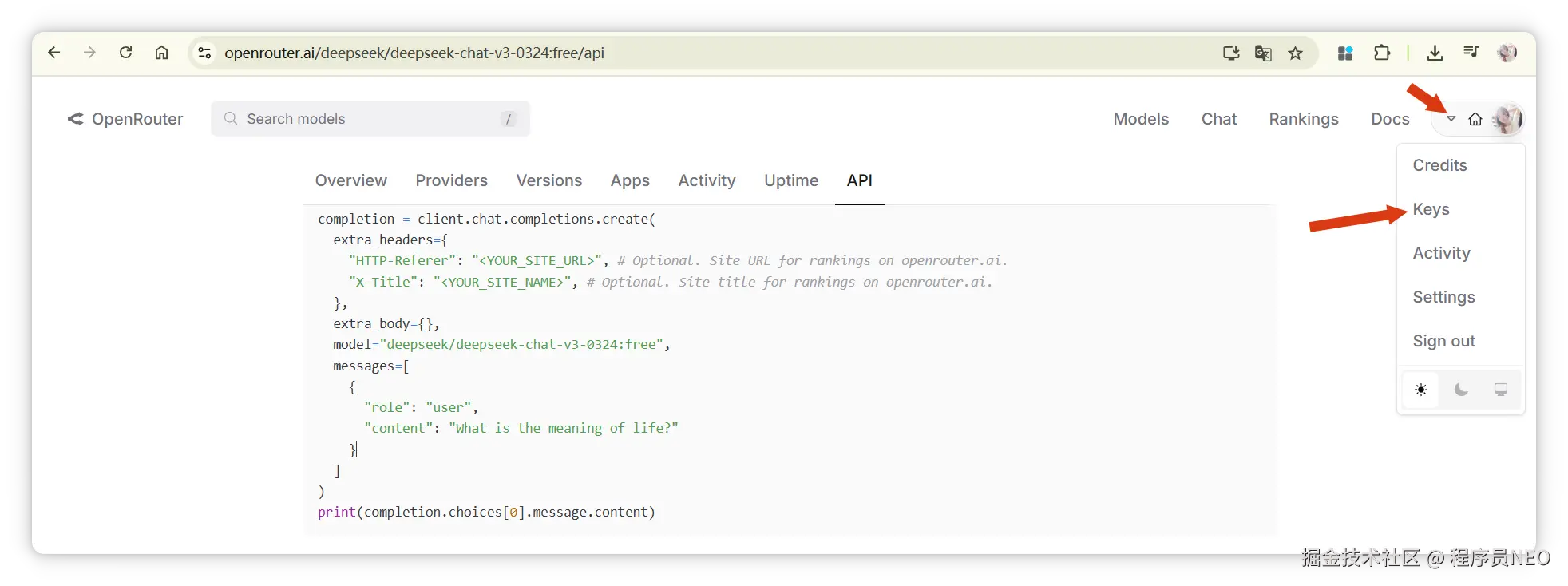 接着获取 API Key,在 Open Router 右上角点击 Keys: