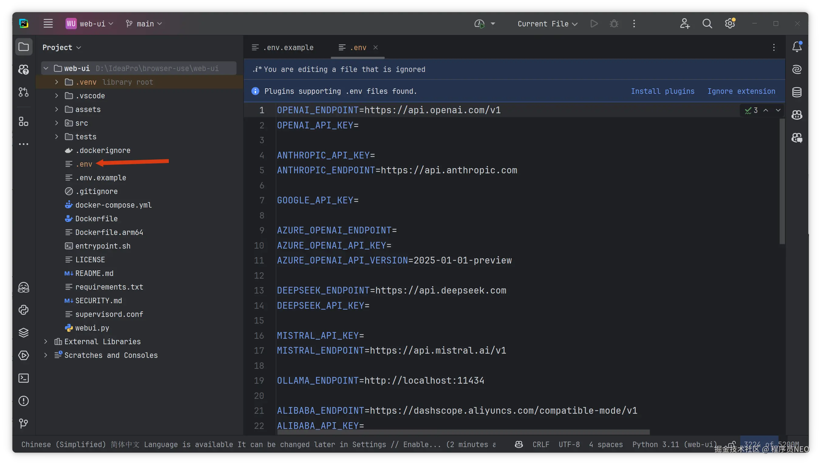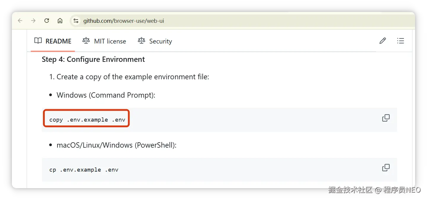 接下来编写配置文件,将官方配置文件样例复制一份,命名为 .env: