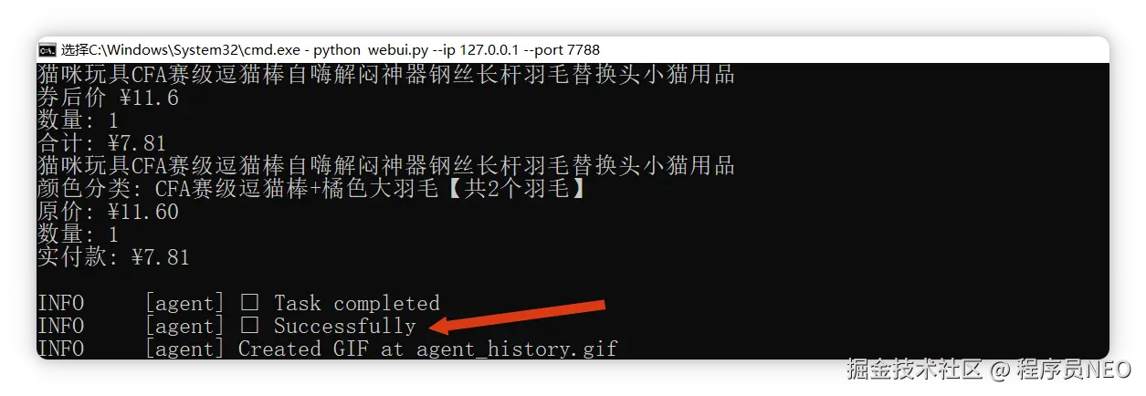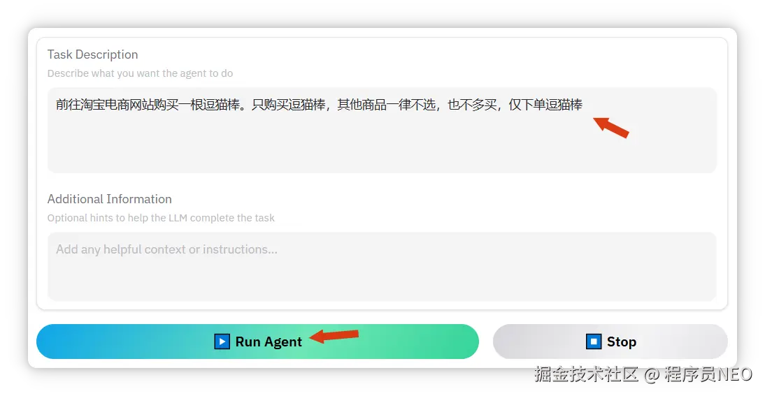 我更换了一个提示词,前往淘宝电商网站购买一根逗猫棒。只购买逗猫棒,其他商品一律不选,也不多买,仅下单逗猫棒。随后点击“Run Agent”。