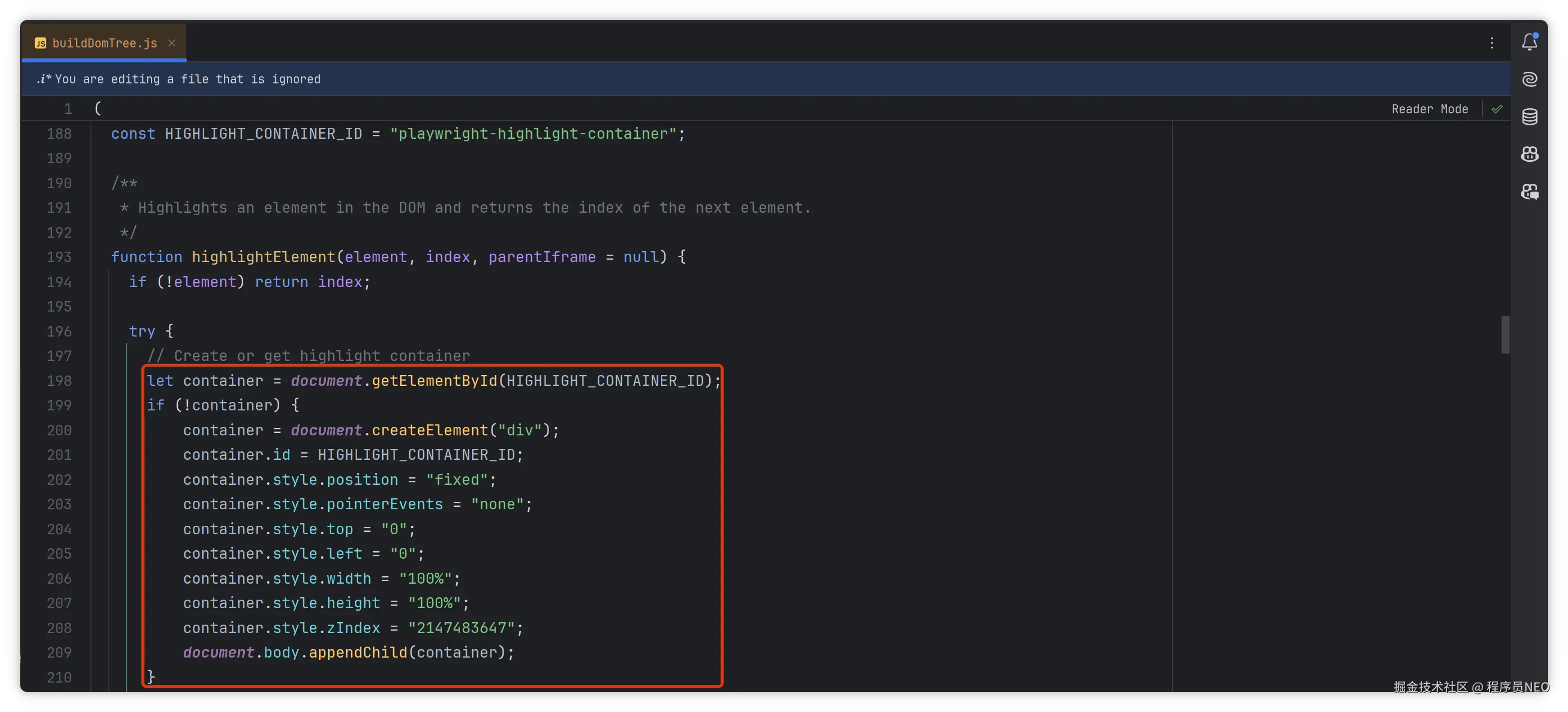 源码中通过 JS 创建 div,并用 document.body.appendChild(container) 添加到网页: