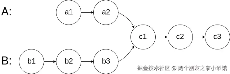 在 A 中,相交节点前有 2 个节点;在 B 中,相交节点前有 3 个节点。