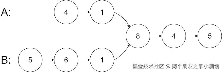 从各自的表头开始算起,链表 A 为 [4,1,8,4,5],链表 B 为 [5,6,1,8,4,5]。