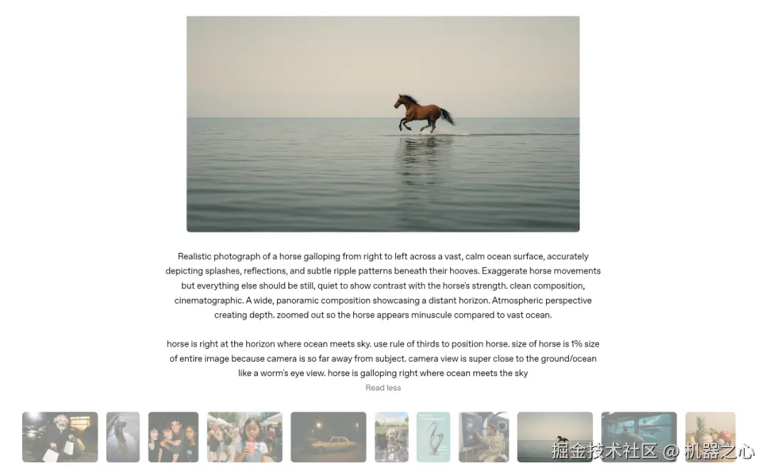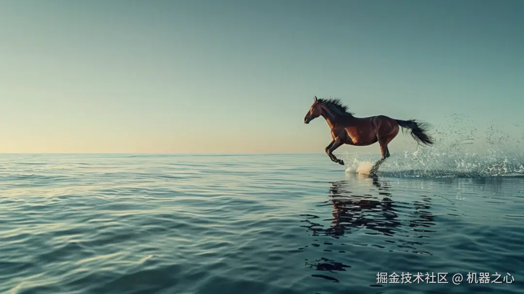 提示词:写实的照片,一匹马从右到左奔驰在一个巨大的,平静的海面上,准确地描绘了溅起的水花,反射,和马蹄下微妙的涟漪图案。夸张马的动作,但其他一切都应该是静止的,安静的,以显示与马的力量形成对比。干净的构图,电影般的。广阔的全景构图,展示远处的地平线。大气透视创造深度。放大后的马与浩瀚的海洋相比显得微不足道。