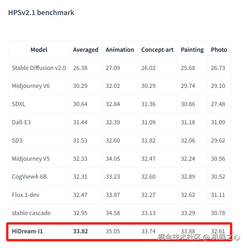 HiDream-I1 在 HPSv2.1 上的得分数据。
