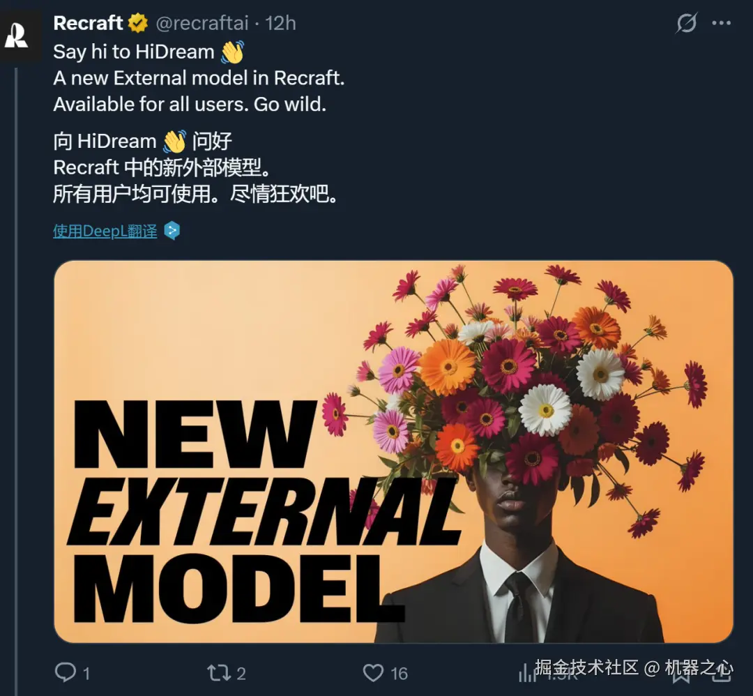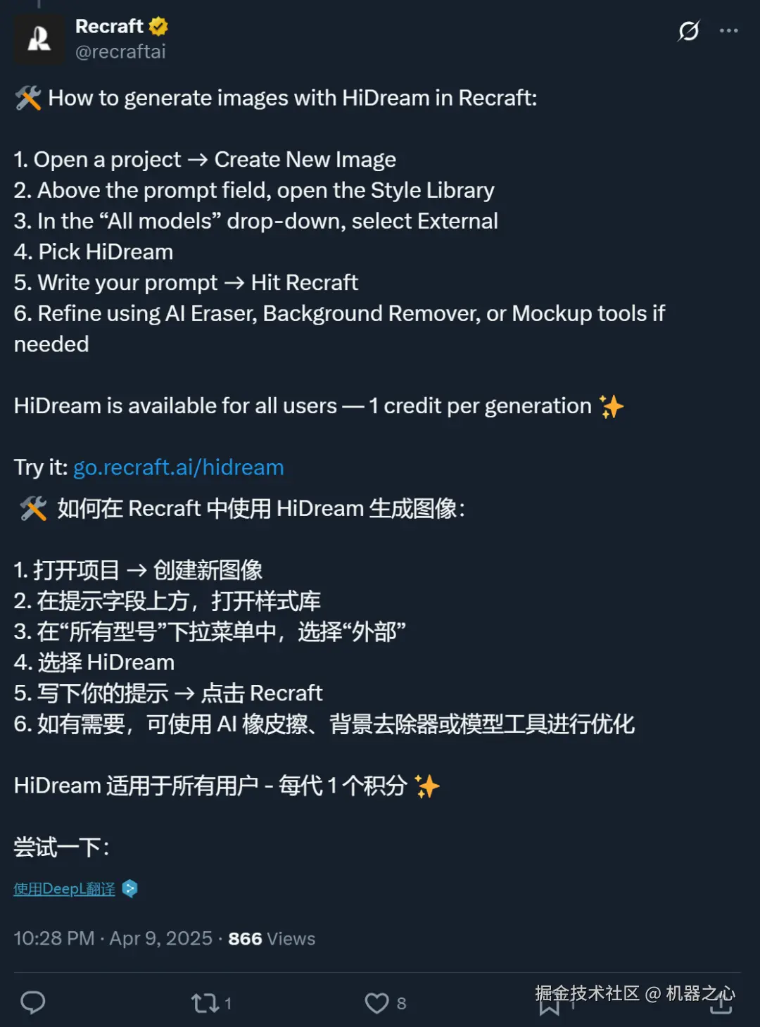而且,由于模型是开源的,其国际影响力也在逐步显现。在开源后两天,文生图大模型竞技场上的另一家模型公司 ——Recraft AI 就宣布,他们已经集成了 HiDream-I1,还手把手教网友怎么选用这个模型。