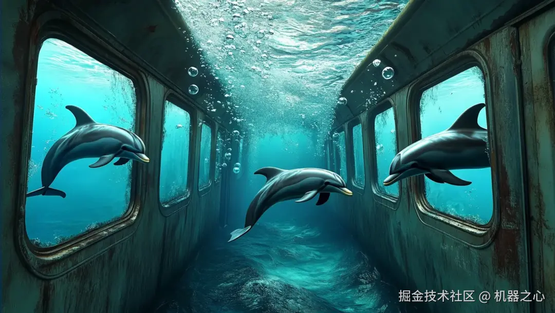 提示词:一个真实的水下场景,海豚从一辆废弃的地铁车厢的窗户游进来,气泡和水流的细节被精确地模拟出来。