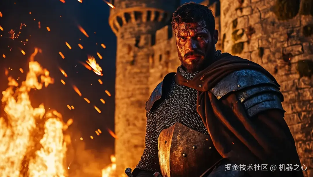 HiDream-I1 生成的图像。提示词:中世纪城堡的石砌城墙,身披铠甲的战士面向镜头,跃动的火焰在他身后勾勒出粗犷的面部轮廓。火星随风溅落在生锈的锁子甲上,右手不自觉地握紧腰间剑柄,深褐色的斗篷在热浪中剧烈翻卷。燃烧的箭矢在远处塔楼持续坠落,橙红火光与靛蓝夜空形成强烈对比,照亮了城墙垛口剥落的青苔和战士眉骨处的陈旧伤疤。