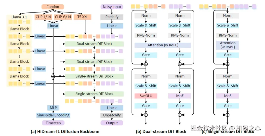 为了提高模型理解文本的能力,HiDream-I1 采用了新的被称为「Sparse Diffusion Transformer(Sparse DiT)」的架构设计。这个架构在 DiT 框架下融合了 Sparse Mixture-of-Expert (MoE)技术,让不同的专家模型处理不同类型的文本输入,各有专精。