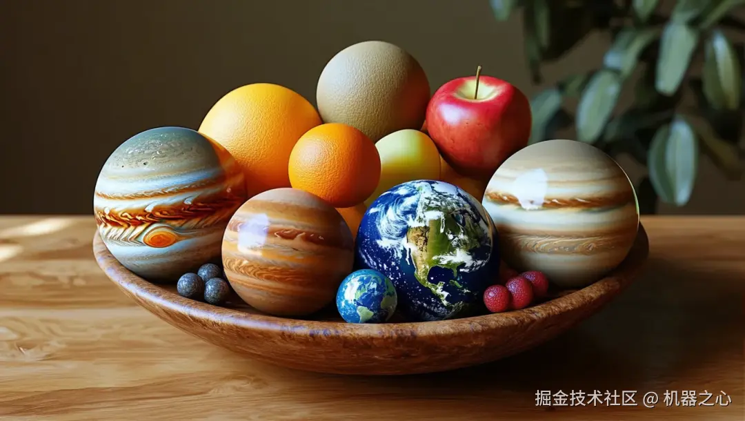 提示词:真实水果与微型行星(木星、土星、火星、地球)混合而成的果盘照片,保持真实的反射、光照、阴影与原图一致,构图干净,纹理真实,细节渲染清晰