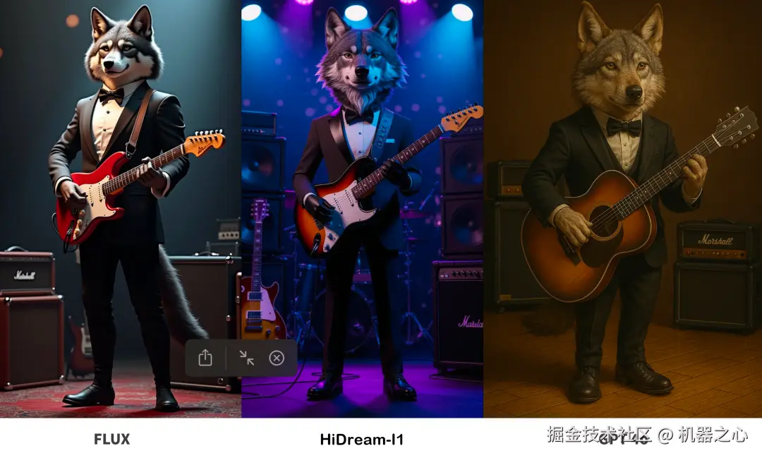 在色彩的呈现上,HiDream-I1 的表现也更出色,能够生成层次分明、色调多样的图像(仔细看下图中狼的脸部毛发,HiDream-I1、GPT-4o 的颜色层次都更丰富)。Flux 的色彩使用虽然也相当丰富,但在某些场景下,色彩的搭配和过渡显得较为单一,缺乏一定的饱和度和层次感。