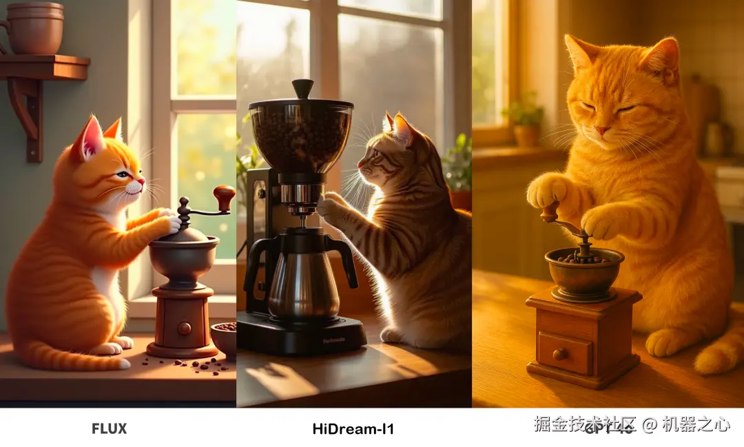 比如在下面这个例子中,HiDream-I1 生成的图像具有更多精细的元素,包括纹理、背景细节以及物体之间的层次感(猫毛在光的照耀下根根分明,给人一种强烈的生机感;咖啡壶的不锈钢材质恰到好处地反射光线,呈现出真实的质感)。相比之下,Flux 虽然也能生成具有良好细节的图像,但在细节材质上不如 HiDream-I1 细腻丰富。