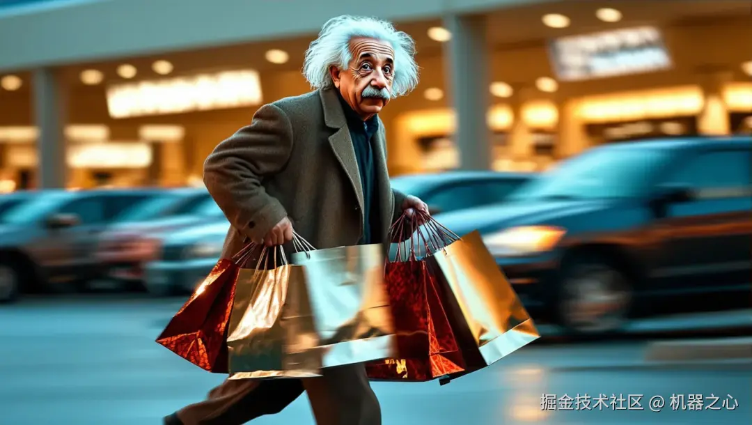 提示词:这是一张狗仔队风格的偷拍照片,爱因斯坦匆忙穿过美国购物中心的停车场,他带着惊讶的表情瞥了一眼,试图避免被拍到。他手里拿着几个锃亮的购物袋,里面装满了奢侈品。他的外套在风中飘动,其中一个包在摇摆,好像他正在大步前进。模糊的背景与汽车和发光的商场入口,以强调运动。相机发出的闪光部分过度曝光了图像,给人一种混乱的小报感。