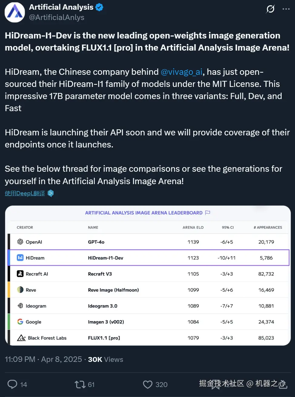 AI 基准测试和分析平台 Artificial Analysis 发推宣布 HiDream-I1 成为文生图开源模型新 SOTA。这个平台采用竞技场模式来评估模型,即同时给两张不同模型生成的图像,让人类从中选出和 prompt 最贴合的。