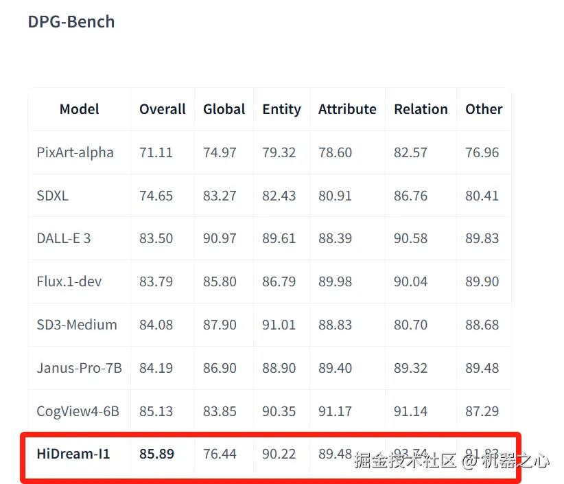 HiDream-I1 在 DPG-Bench 上的得分数据。