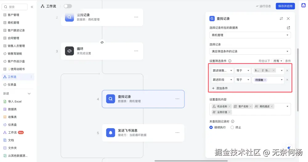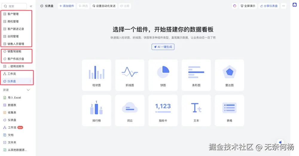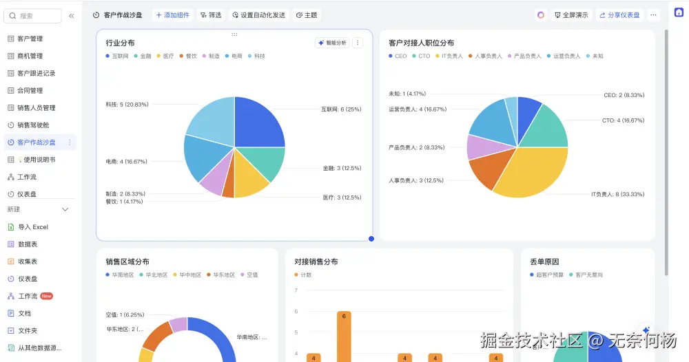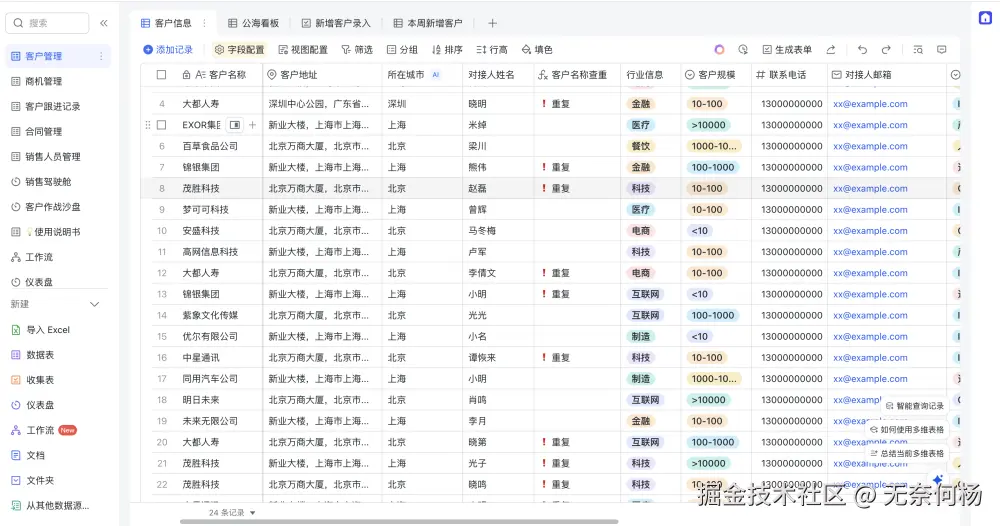 如下是一个轻量级CRM多维表格的模版,功能相当丰富,完全是零开发、全配置的。