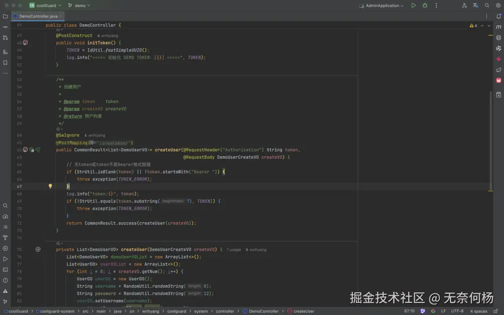 demo分支相比于pro分支做了一个仅仅token认证的请求新增用户的接口,其实就是下面这样的接口,新增随机账号密码的用户,并分配指定演示角色。