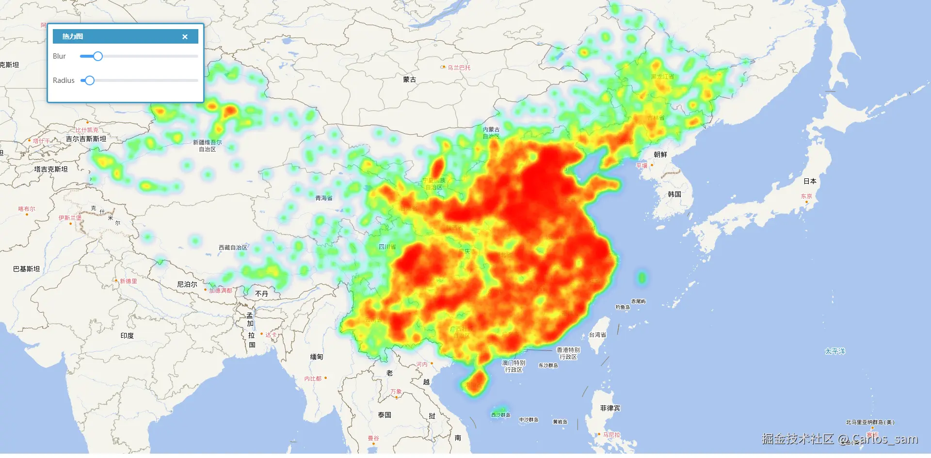 Openlayers中主要通过 Heatmap图层实现热力图。在创建热力图的过程中主要有以下的几个属性比较重要,热力图的效果主要由它们决定: