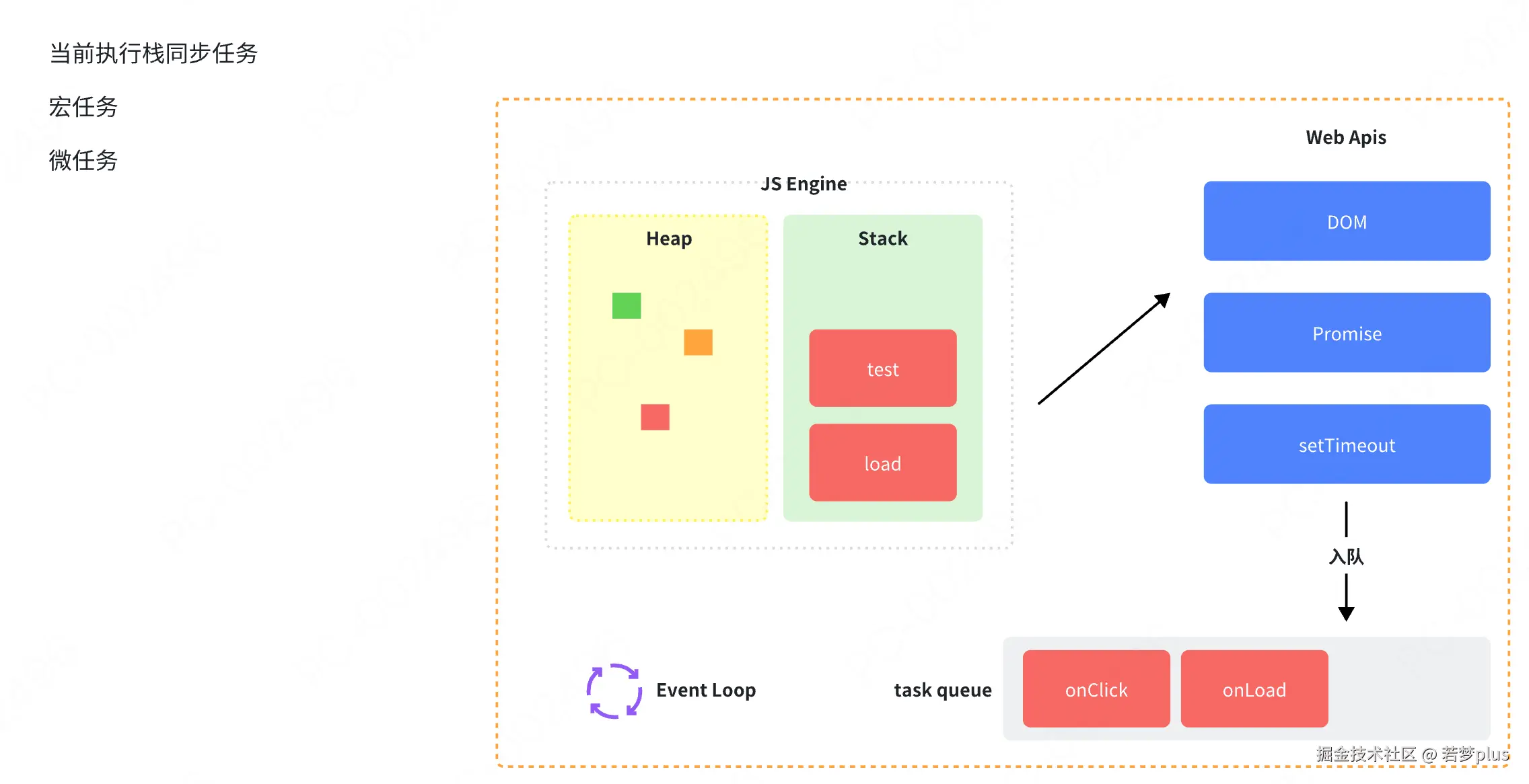 - 微任务队列:与消息队列类似,但处理优先级更高。微任务(如Promise的回调)在当前宏任务执行完毕后、下-个宏任务开始前执行。