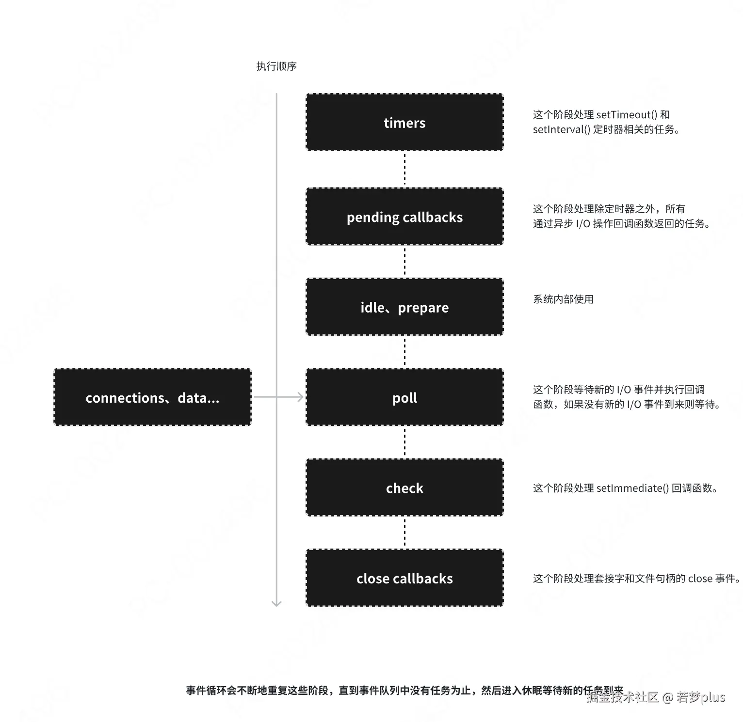 - Node.js 的事件循环(Event Loop)是一个处理异步操作的机制,它会按照顺序依次执行不同阶段任务。事件循环机制中分为多个阶段,每个阶段都有自己的任务队列,包括: