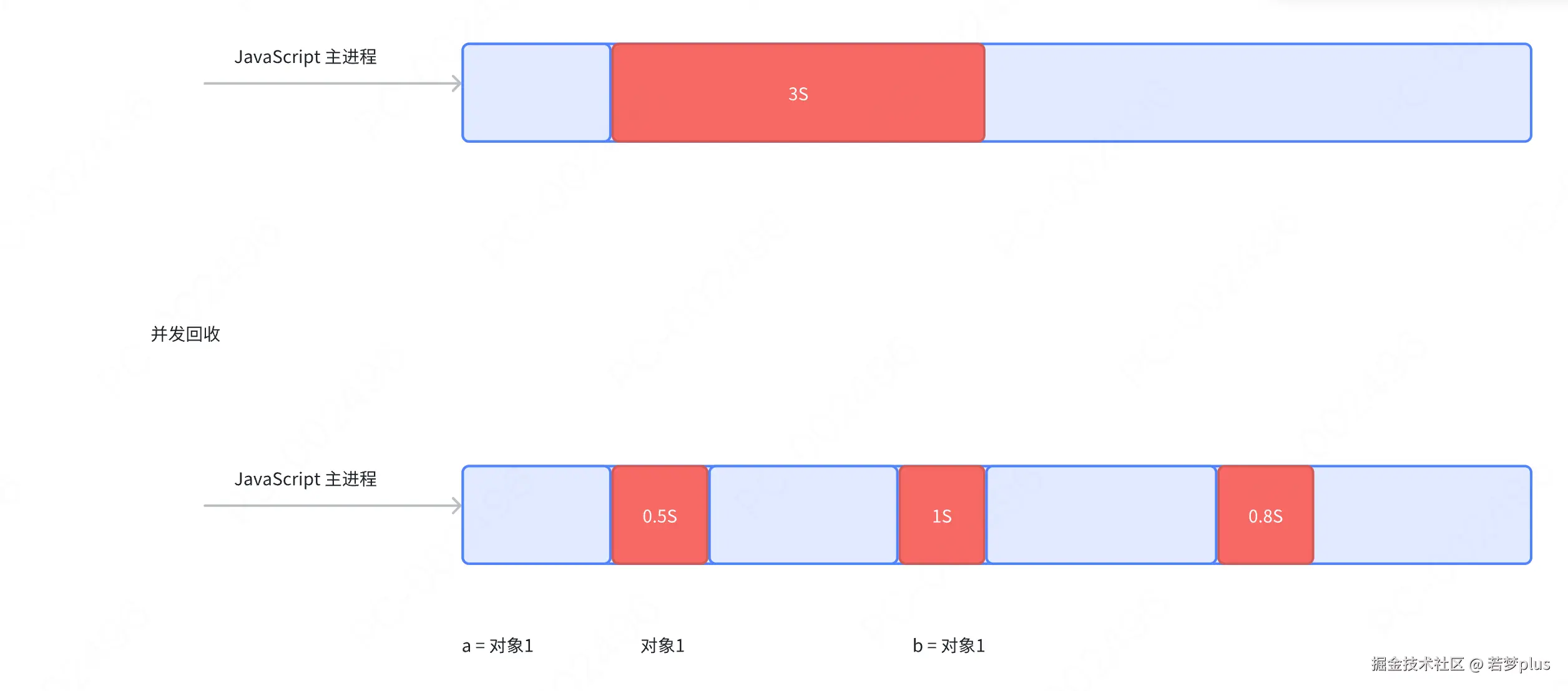 - 而标记清除算法需要每隔一段时间进行一次,那在应用程序(JS脚本)运行过程中线程就必须要暂停去执行一段时间的GC,另外,标记清除算法需要遍历堆里的活动以及非活动对象来清除,而引用计数则只需要在引用时计数就可以