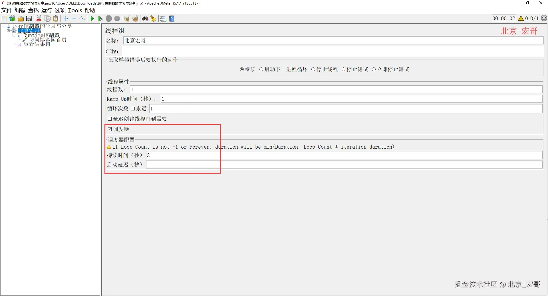 线程组设置3,Runtime控制器设置2,但是运行时间是2s。所以从上边的运行时间得出结论:如果线程组中设置了持续时间,Runtime 控制器也设置了 运行时间,那么会优先于线程组中的设置。