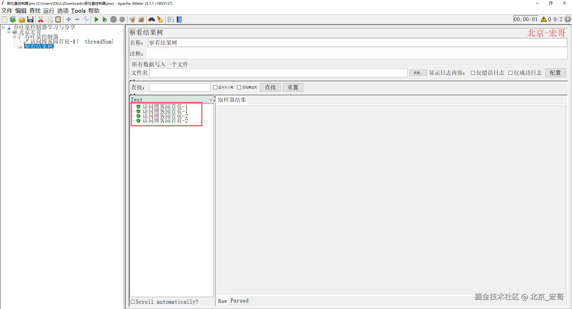 2、配置好以后,运行JMeter,然后查看结果树(执行了2次),如下图所示: