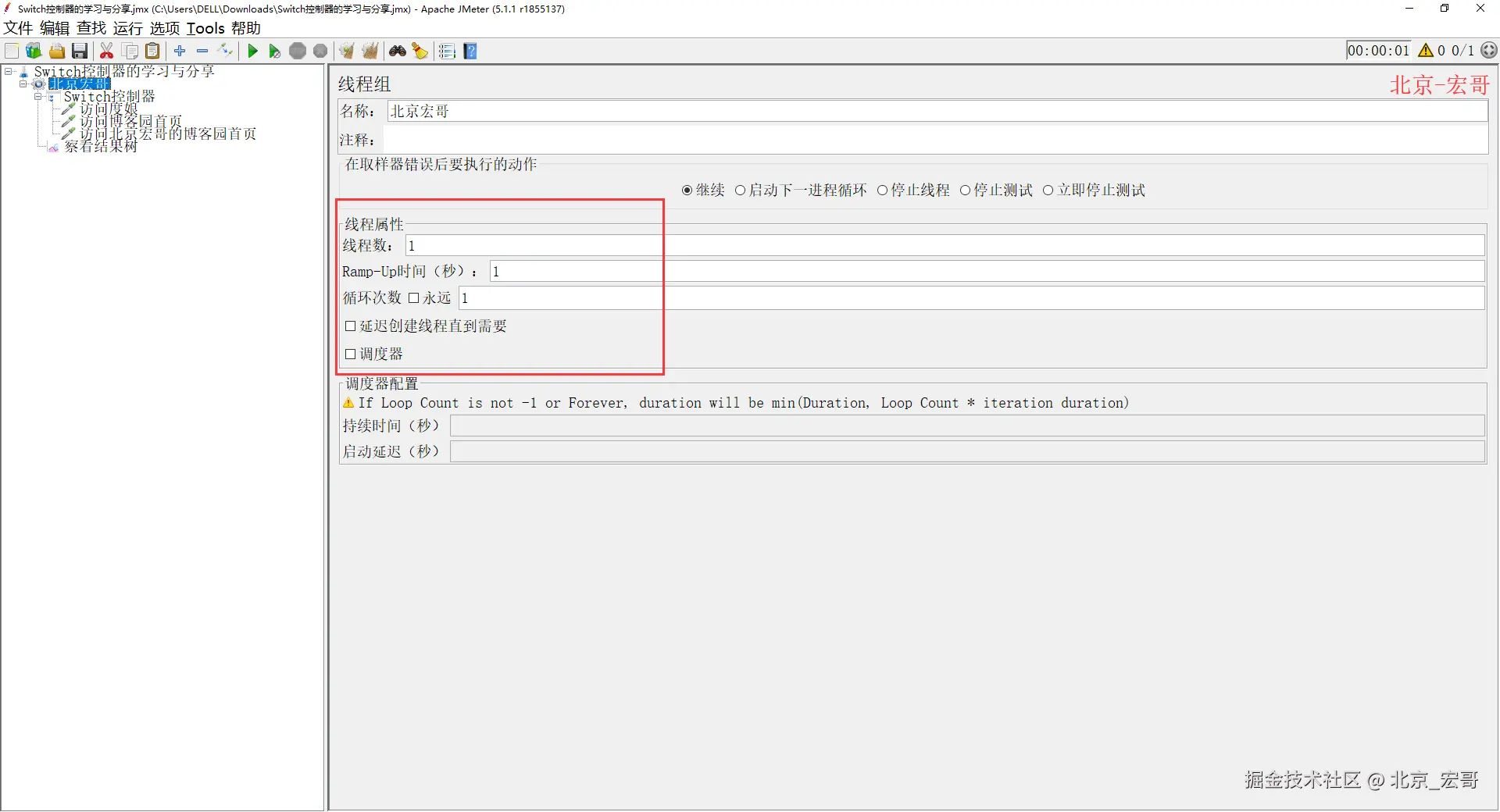Runtime: 默认为1,去掉1则默认为0,此时不执行其节点下的元件。 与线程组中的调度器的持续时间 效果一致。不填 或 0,不会执行样例