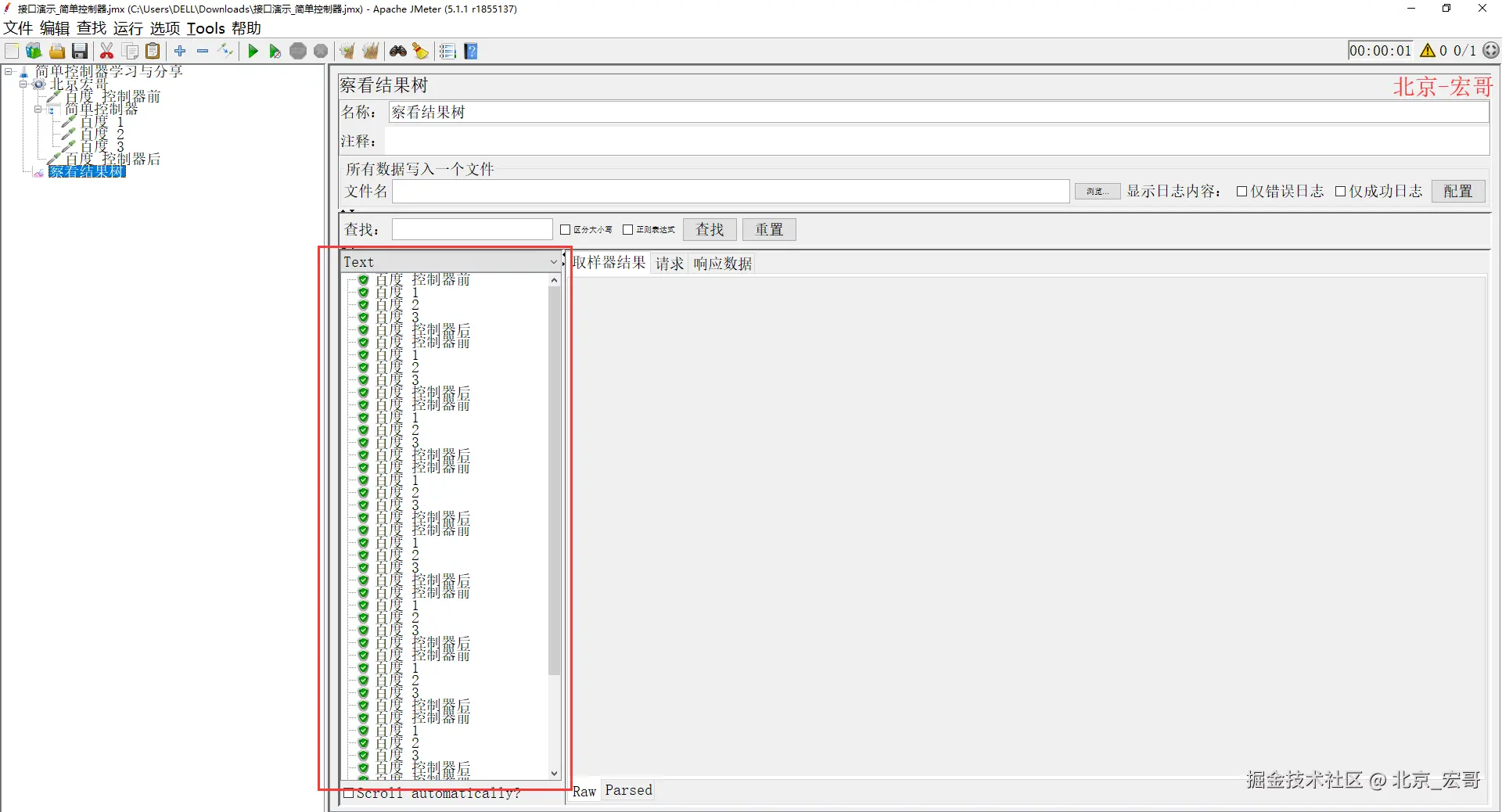 4、配置好以后,点击“保存”运行JMeter,然后查看结果树(执行了第1 <数值为0或者不填,执行第1个取样器> 个取样器),如下图所示: