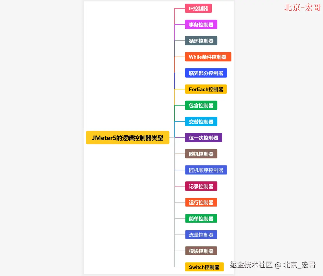 如果上图您看得不是很清楚的话,宏哥总结了一个思维导图,关于JMeter5的逻辑控制器类型,如下图所示: