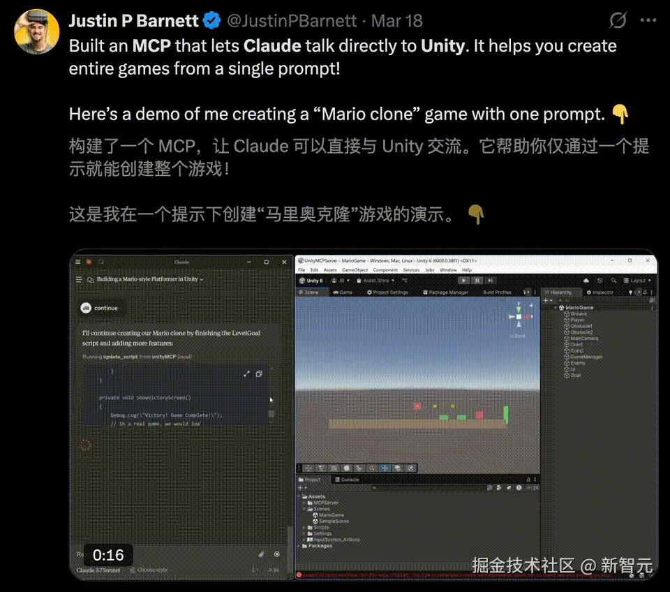 举个栗子,Unity MCP 服务器的创建者称,MCP 可以让 Claude 与 Unity 直接交流,全程只用一个提示就能创建整个游戏。