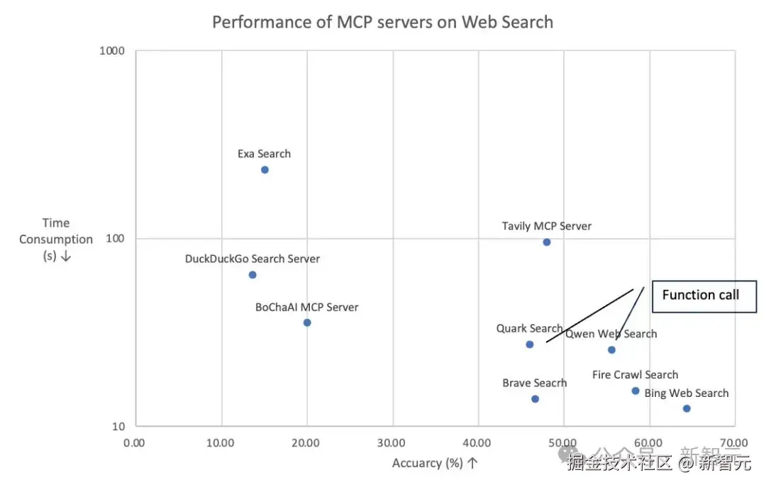 他们设计了一组针对 Web Search 场景的调用效果对比,由模型连接 MCP 进行问答,对回答的精度采用模型打分。