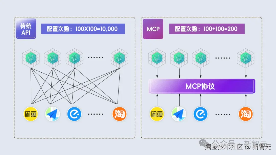 在开发过程中,开发者需要调用的工具越多,越能凸显出 MCP 的价值,比如同样是 100 个 AI 智能体和 100 个外部工具: