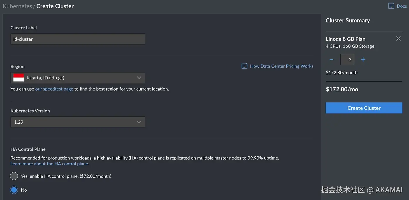 接下来,我们将使用Akamai Connected Cloud Linode Kubernetes Engine(LKE)在雅加达区域建立一个集群。