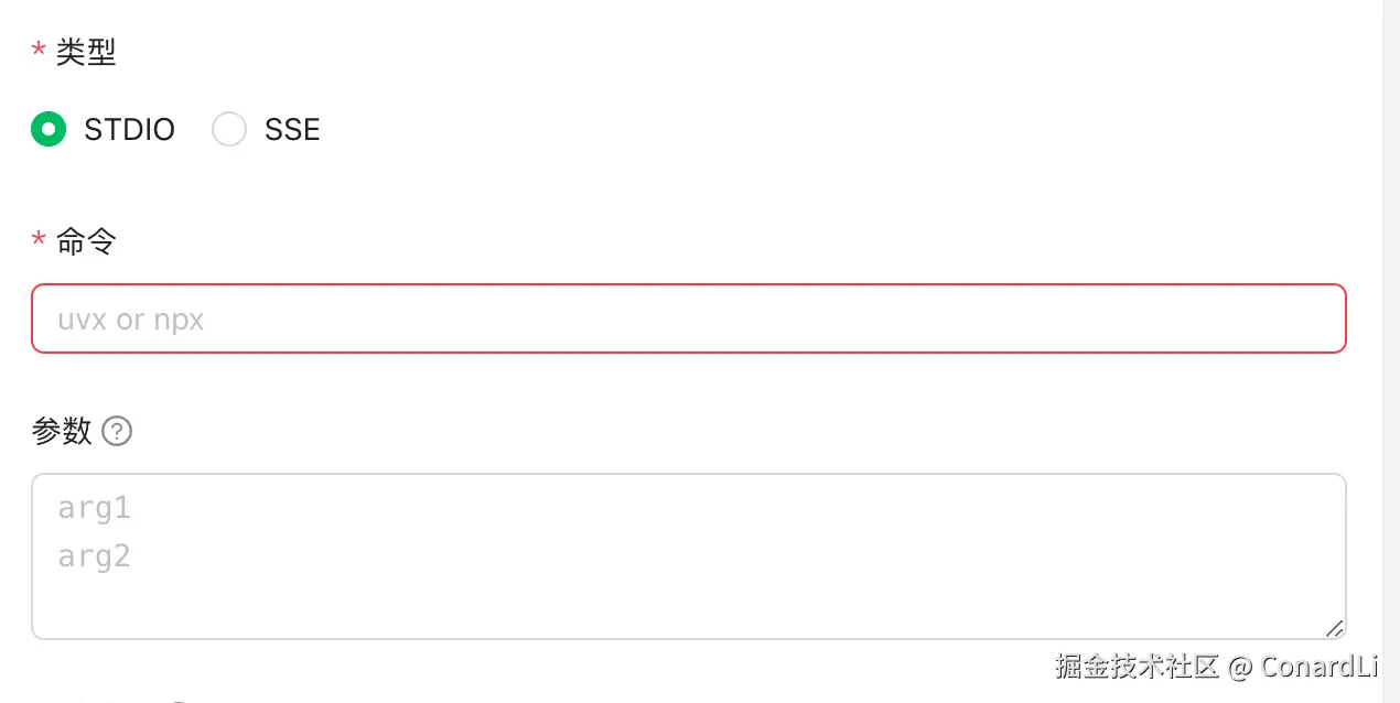下面再来说说配置里的命令,对应 JSON 配置中的 command 参数,在没有填写时,这里默认推荐的是 uvx 和 npx: