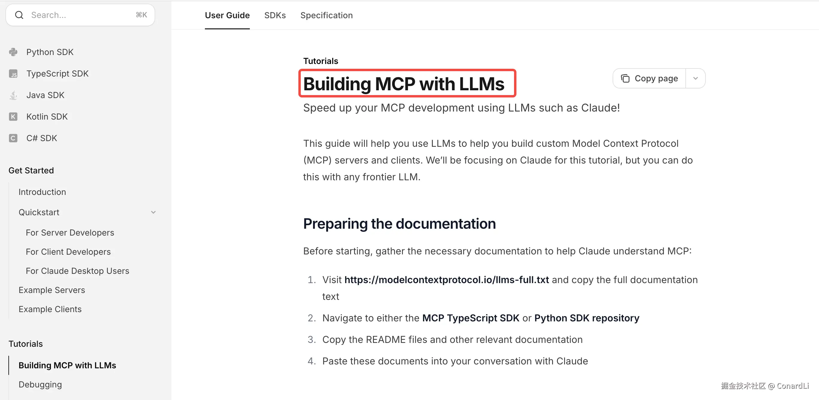 写的挺清晰的,如果你懂代码,仔细看一遍很快就能上手,但在 AI 时代,从零自己去写肯定不可能了,官方其实也建议通过 AI 来帮我们实现 MCP,所以在文档中单独还提供了一个 Building MCP with LLMs 的章节。