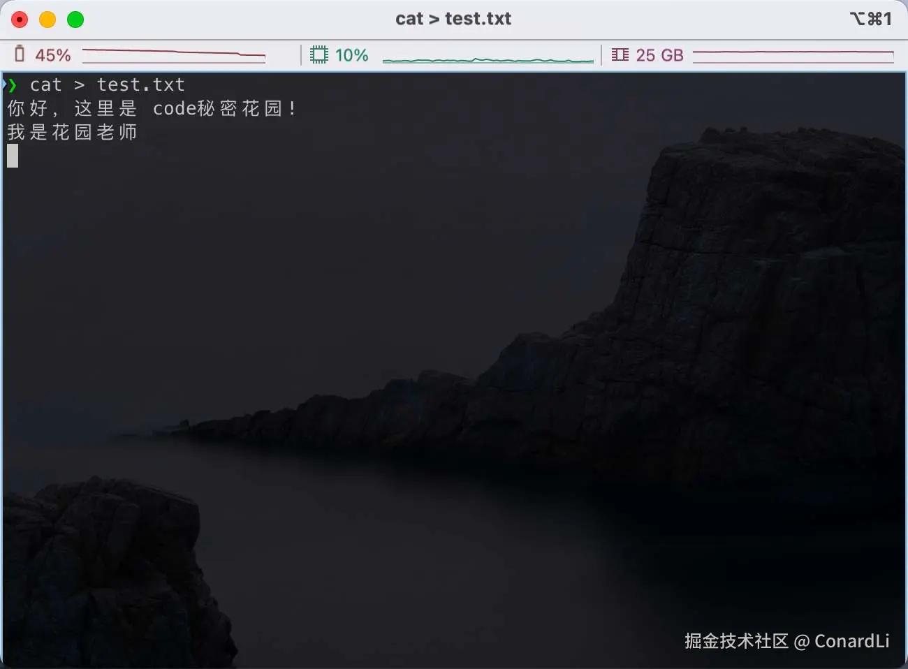 在这个例子中,你输入了 你好,这里是 code秘密花园! 和 我是花园老师,cat 命令将这些内容从标准输入读取后,马上输出到标准输出。