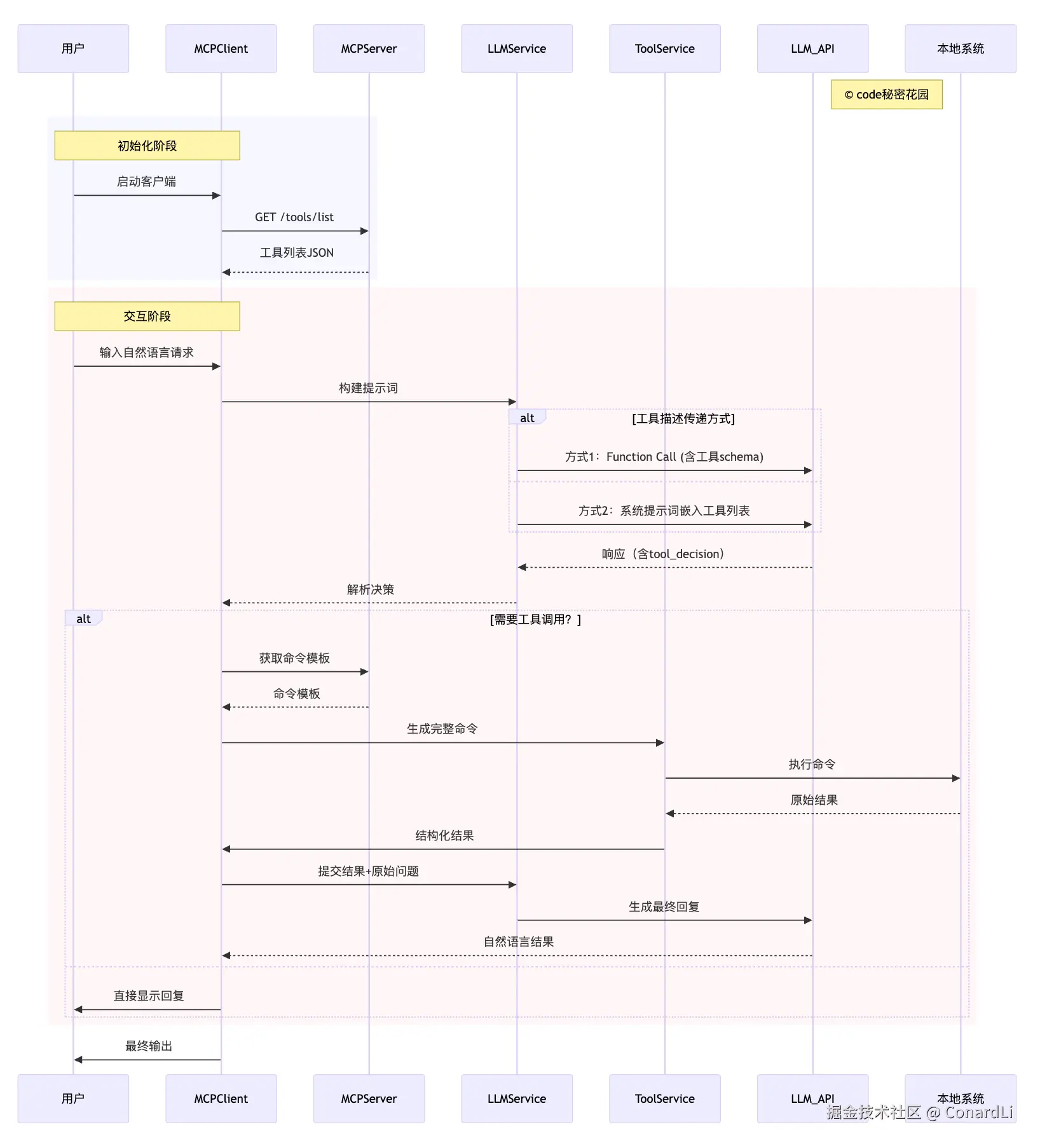 - 生成与执行命令: MCPClient 将用户输入参数与命令模板结合,通过 ToolService(工具执行服务)生成完整可执行命令,并提交给 本地系统 执行。