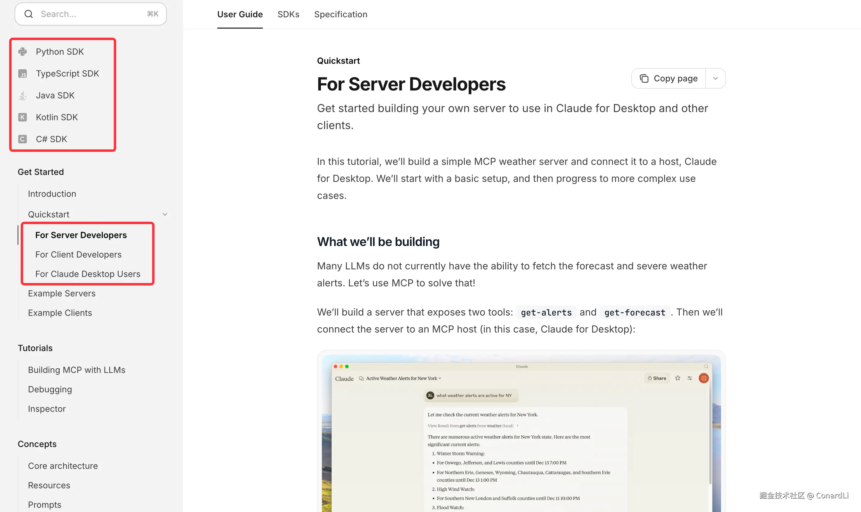 在官方文档(modelcontextprotocol.io/quickstart/… MCP Server 的开发方式,以及官方提供的各个语言的 SDK 的示例代码: