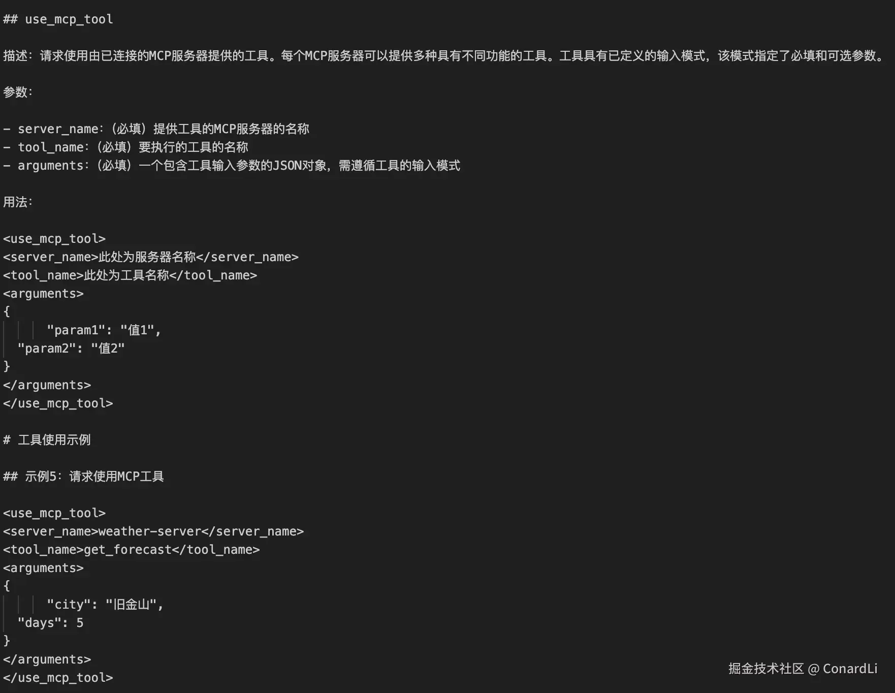 前面的部分都是我们在 MCP Server 中配置的内容,属于固定的部分。而大模型做的,就是根据用户当前的输入,以及当前支持的 MCP 工具列表,判断出要不要调用这个工具,如果要调用,生成结构化的工具参数,最后 MCP Client 通过 STDIO 协议将这个结构化的参数再传递给 MCP Server。