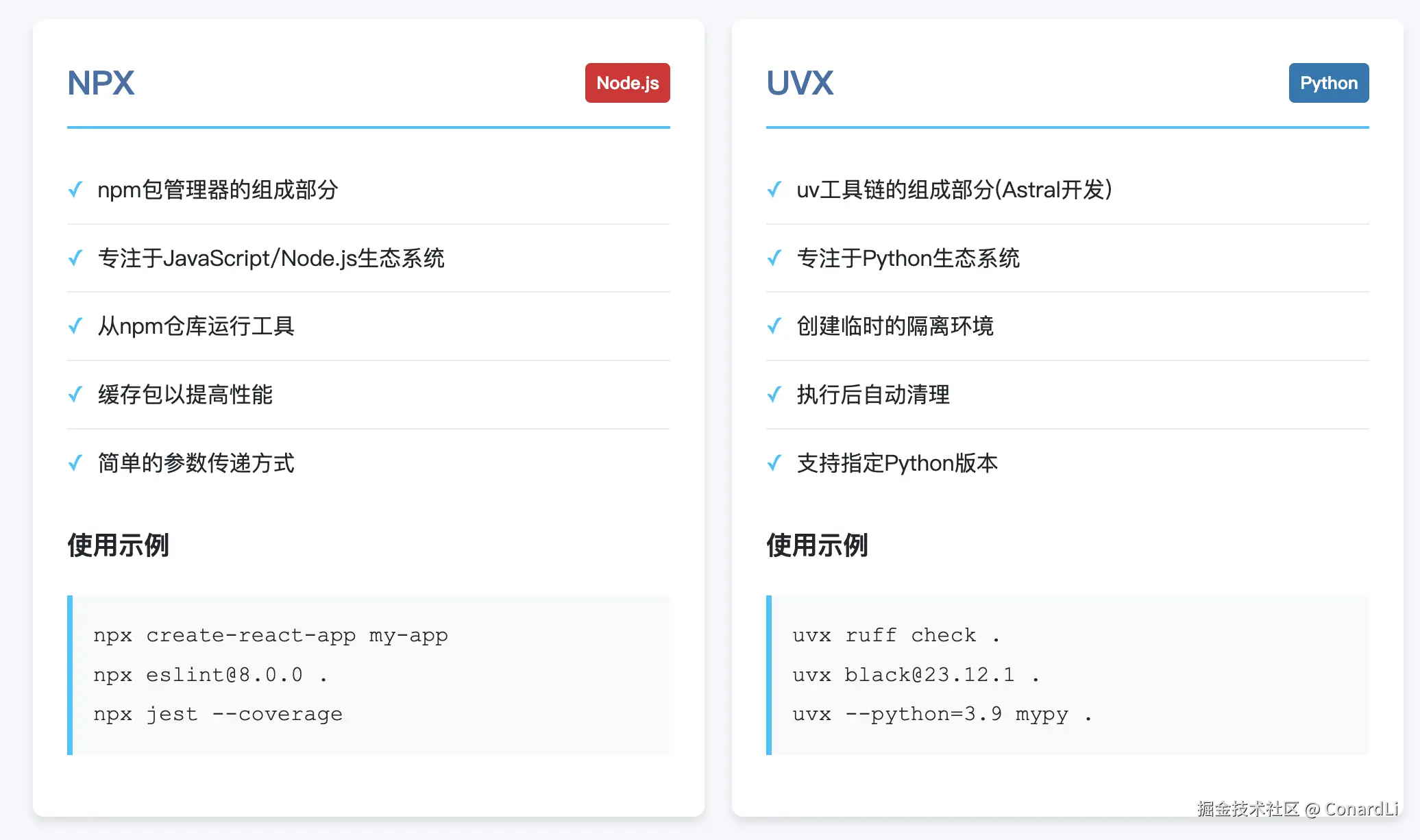 在上面的命令中,还有一个选项是 uvx,和 npx 类似,它也可以直接让你临时执行某个工具包,而无需全局安装。不过 uvx:是 uv 工具链的一部分,主要聚焦于 Python 生态系统,它会创建一个临时的隔离 Python 环境来运行 Python 工具包。
