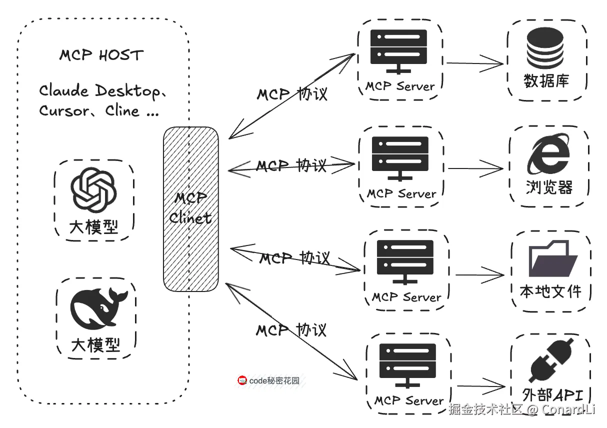 MCP 大概的工作方式:MCP Host,比如 Claude Desktop、Cursor 这些工具,在内部实现了 MCP Client,然后MCP Client 通过标准的 MCP 协议和 MCP Server 进行交互,由各种三方开发者提供的 MCP Server 负责实现各种和三方资源交互的逻辑,比如访问数据库、浏览器、本地文件,最终再通过 标准的 MCP 协议返回给 MCP Client,最终在 MCP Host 上展示。