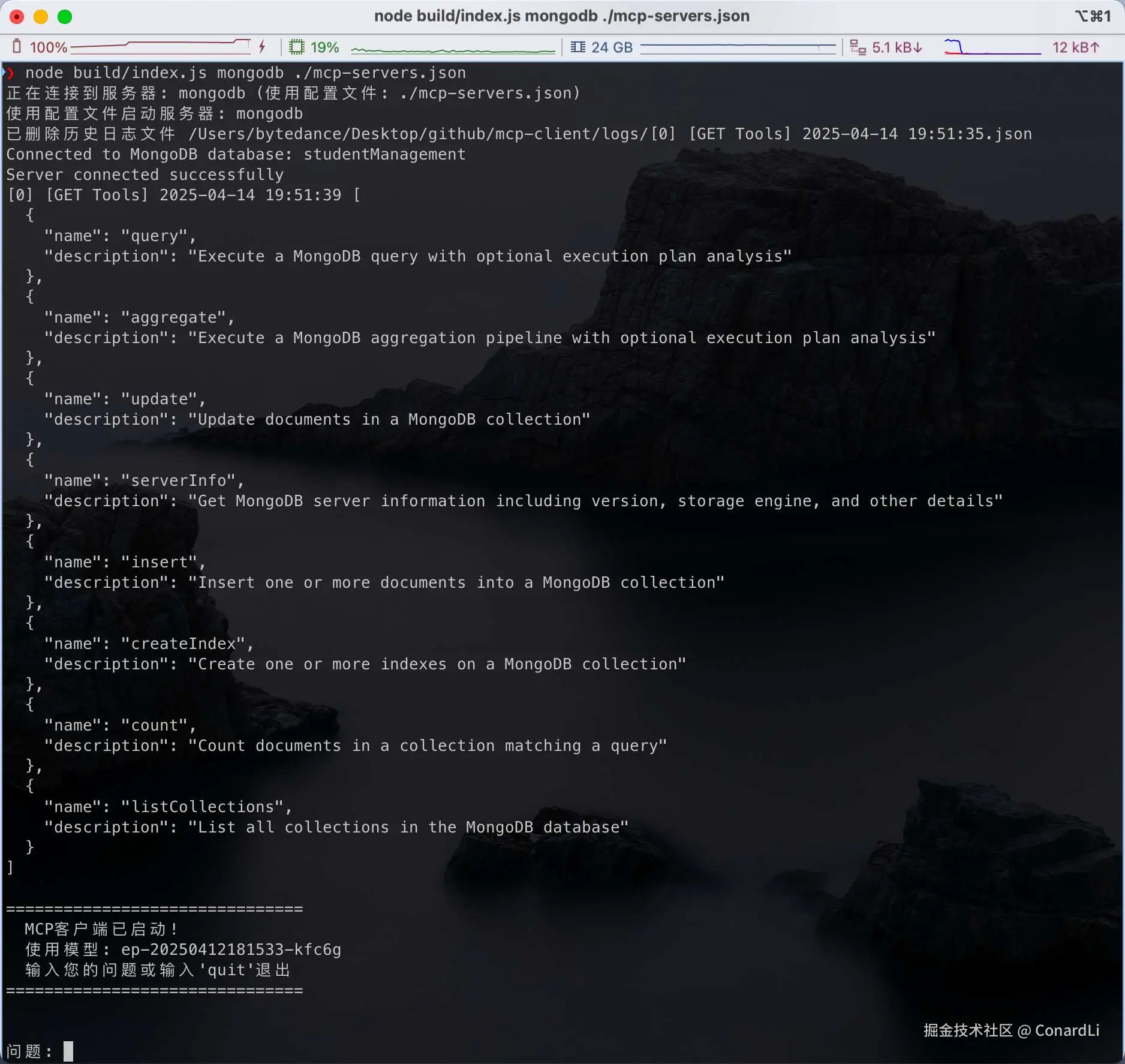 然后执行 node build/index.js mongodb ./mcp-servers.json,客户端成功启动: