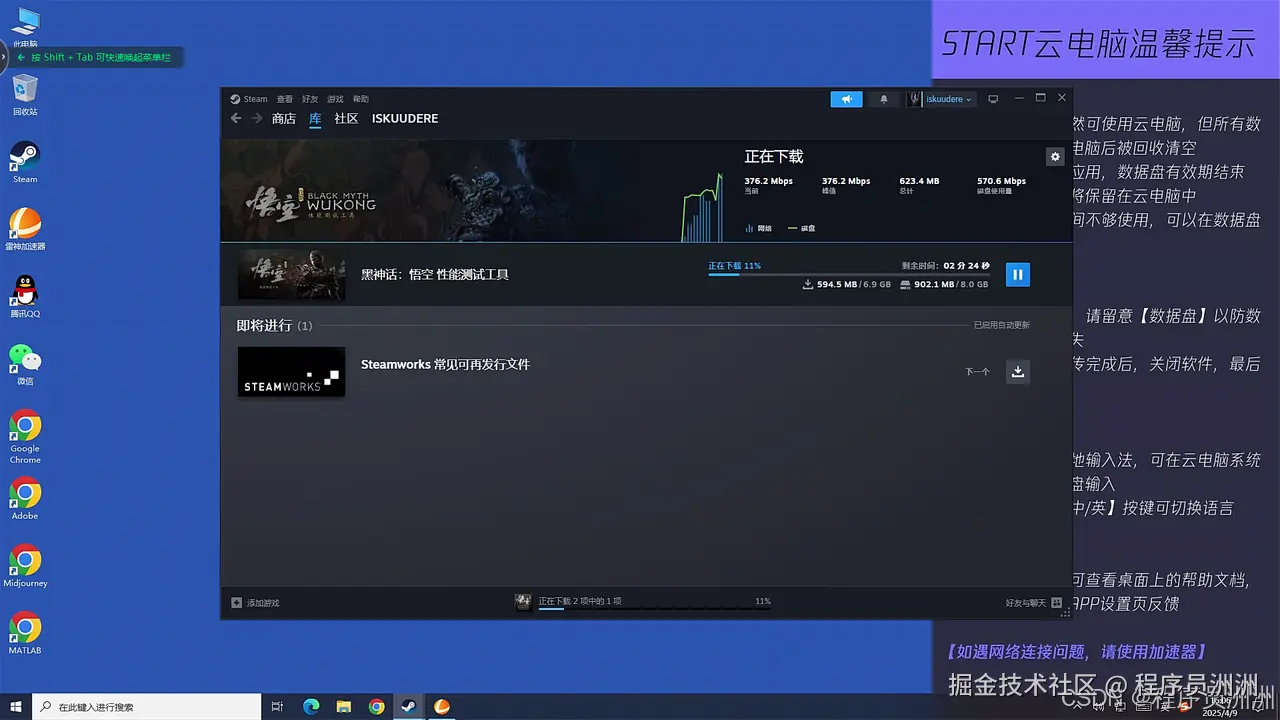 我通过 START云游戏下载并运行《黑神话:悟空》的 Steam 版本,由于 START 本身主打“即点即玩”的服务逻辑,因此游戏安装过程异常迅速,几乎不需要等待,资源就已经分配完毕开始加载了。
