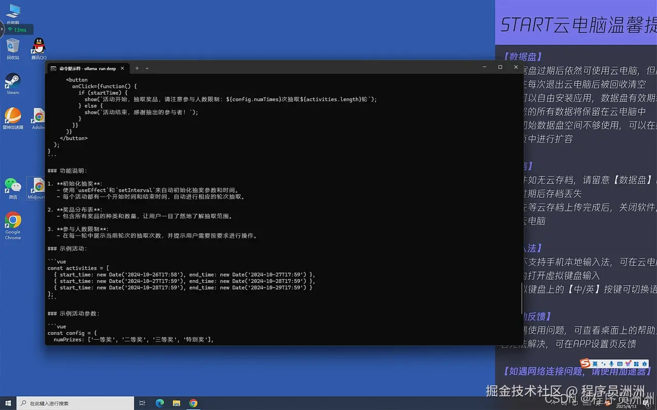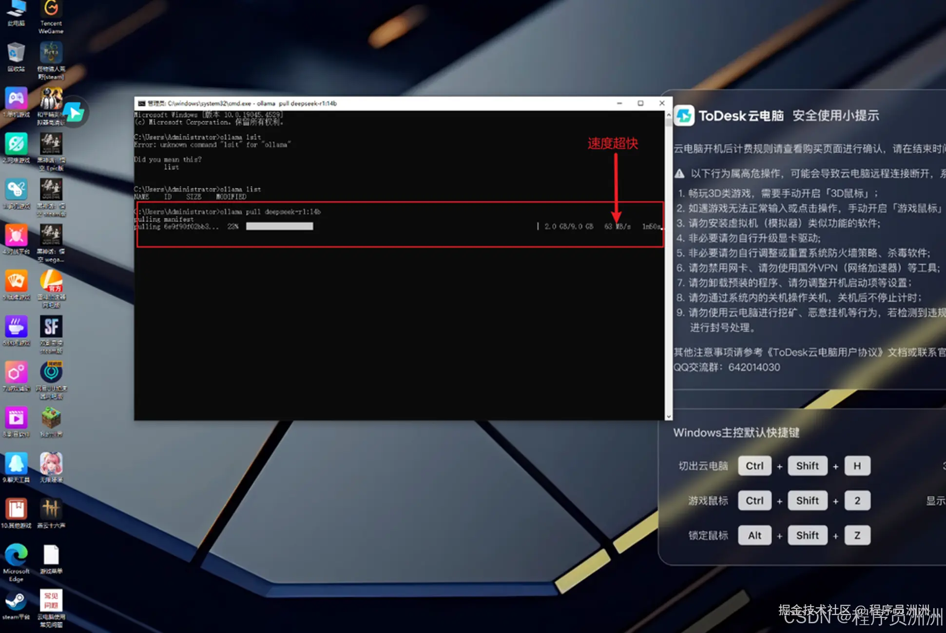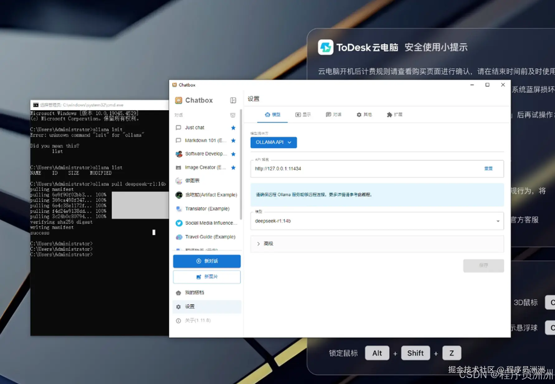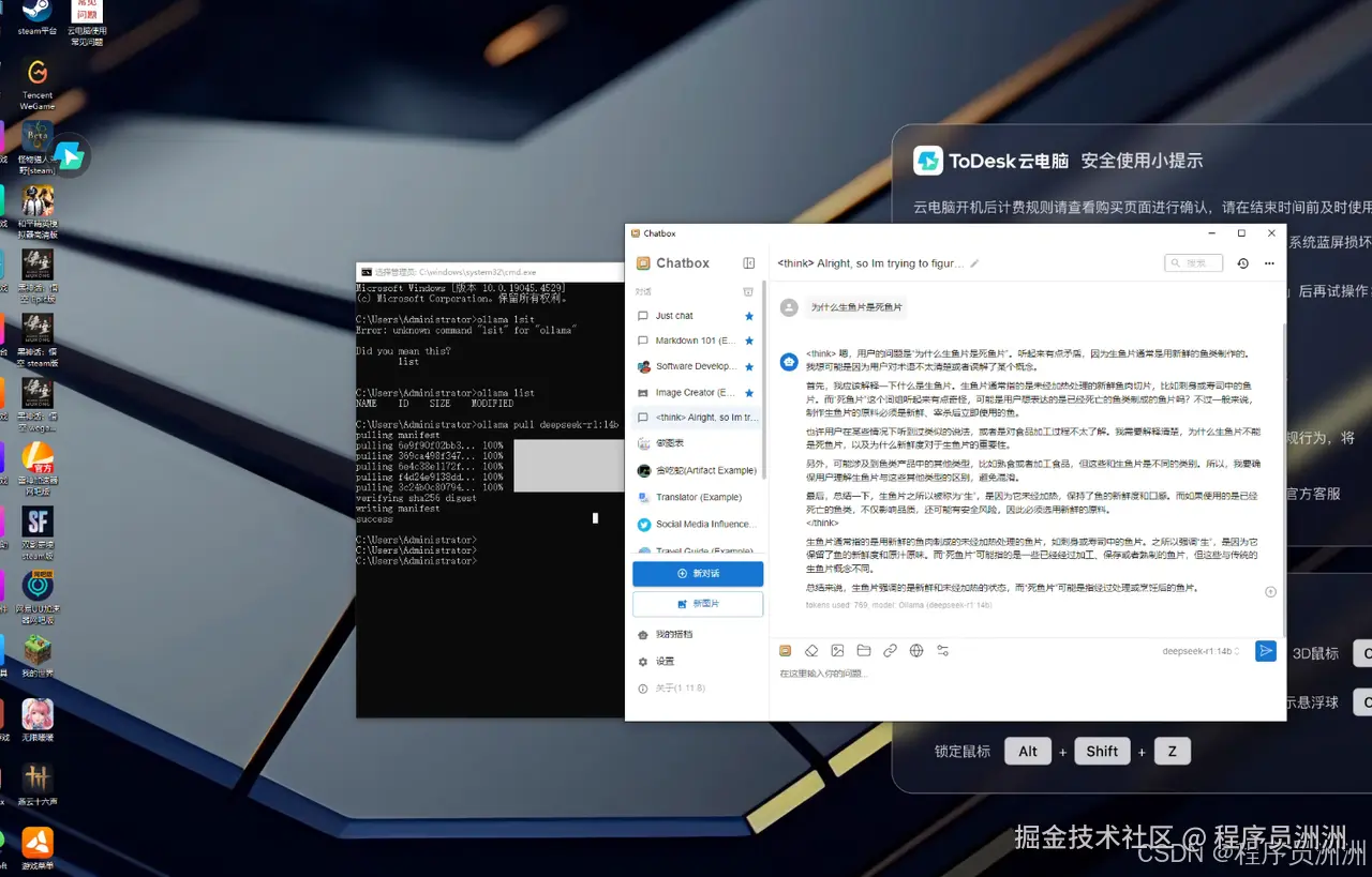 这里我还尝试用ToDesk云电脑部署了ollama + deepseek 14b + chatbox应用。在部署过程中,模型加载时间约为 20 秒,生成速度稳定在 30 tokens/s 以上,Chatbox 的响应也非常迅速。除此之外,ToDesk云电脑还预制了,数据存储安全可靠,适合需要高性能计算和稳定性的用户。