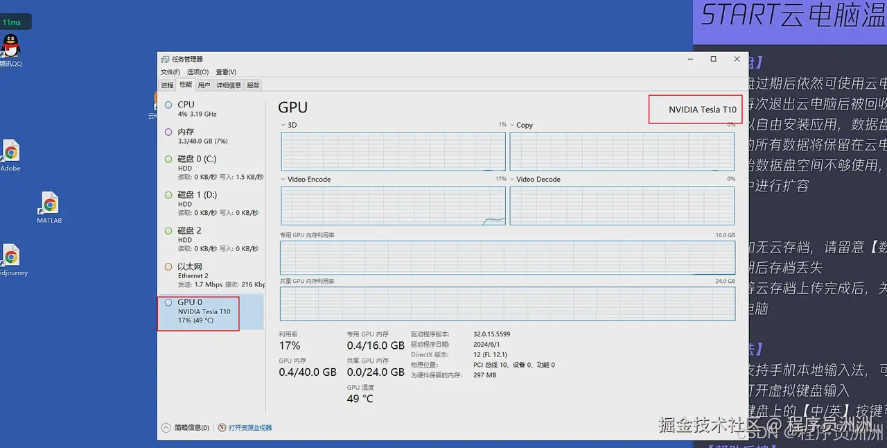 GPU算力方面,虽然官方宣称性能接近RTX 3060,但实测中发现实际提供的是NVIDIA Tesla T10——其图形渲染能力虽不及RTX系列显卡,但在远程渲染与视频编码方面具有一定优势,足以胜任1080p甚至4K的流媒体传输任务。