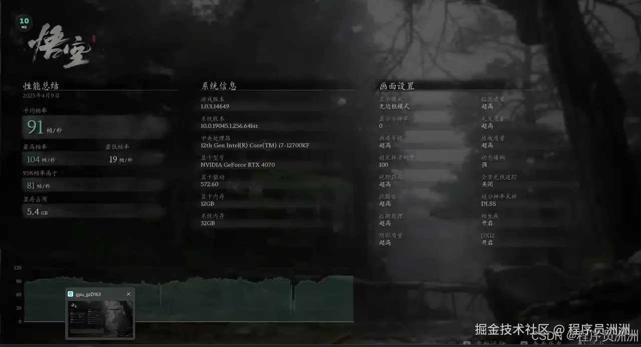 如下图所示,ToDesk云电脑在运行黑神话时平均帧率高达 91 FPS,最高帧率突破 104 FPS,95% 帧率也稳定在 81 FPS 左右,游戏运行期间显存占用约 5.4GB,整体波动非常小,图形表现流畅,这说明这种显卡直通的方案,将一块消费级高性能显卡完整分配给我了,没有做虚拟化或资源切分,体验起来就是爽。