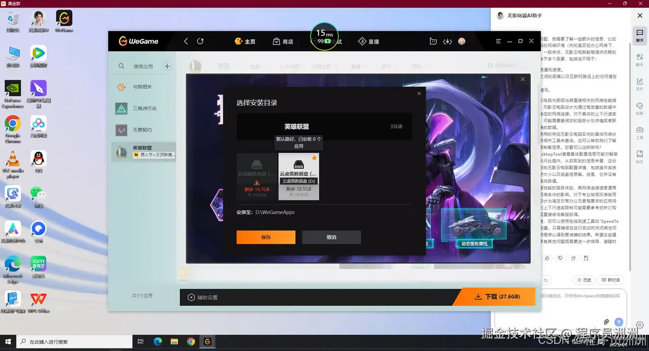 接下来看看阿里的无影云,发现它是没有预装英雄联盟的,只能用独立云镜像下载该游戏,然后无影云给出了实时的操作延迟15ms左右,还是不错的。