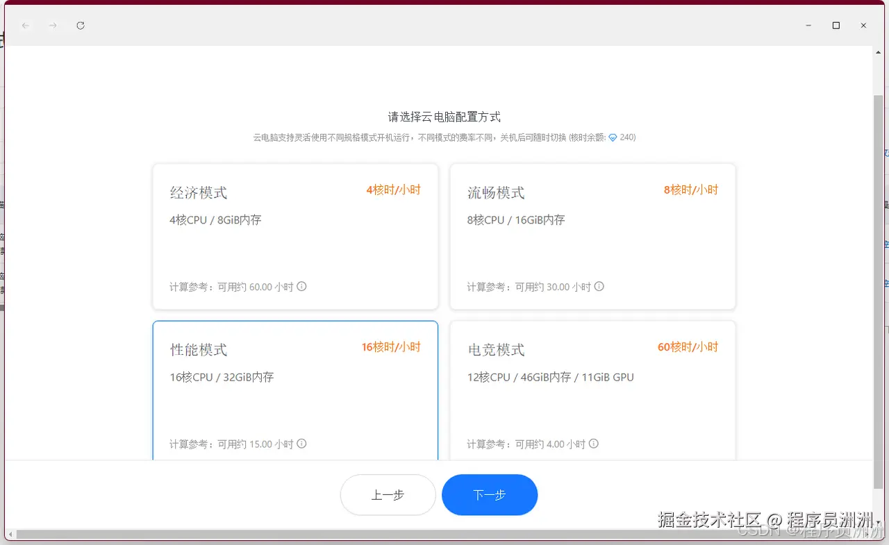 阿里云的云服务一直是行业领先,而个人云电脑服务也比较专业,可以选择不同的操作系统和不同的配置,相对应的费用也不一样。本次我们体验的是无影云个人版中的黄金试用服务,选择的是性能模式: